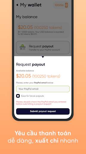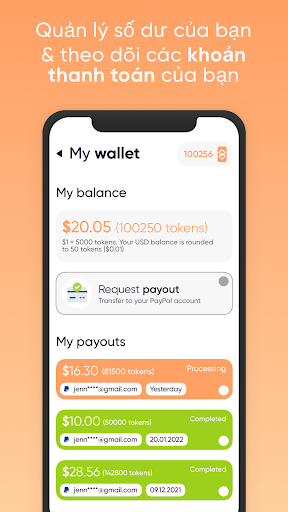 Chúng tôi là một trong những nền tảng di động trả tiền hàng đầu trên thị trường, và chúng tôi có nhiều tùy chọn thanh toán, bao gồm PayPal, thẻ quà tặng và nhiều hơn nữa. Với tính năng thanh toán tiền mặt nhanh chóng của chúng tôi, bạn có thể được thanh toán nhanh chóng và bắt đầu tận hưởng thu nhập của mình ngay bây giờ 💵