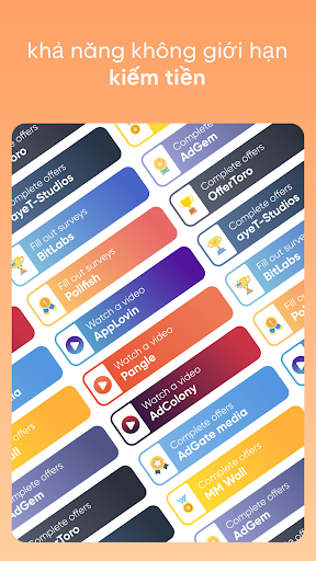 Dịch vụ tuyệt vời của chúng tôi cũng là một cơ hội tuyệt vời cho bất kỳ ai muốn kiếm thu nhập bền vững 👩💻👨💻 Ứng dụng kiếm tiền của chúng tôi cho phép bạn kiếm tiền trực tuyến mà không cần bất kỳ nỗ lực nào, chỉ bằng cách xem video, tham gia khảo sát và chơi trò chơi 🔥 Đúng vậy, chúng tôi mang lại cơ hội kiếm tiền không giới hạn. Chúng tôi thường xuyên thêm mới chúng!