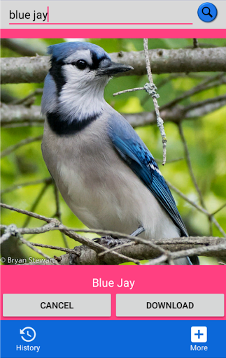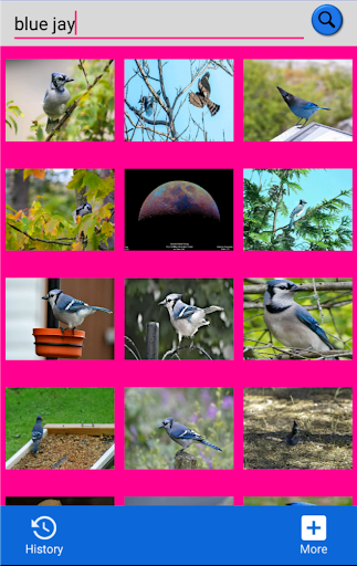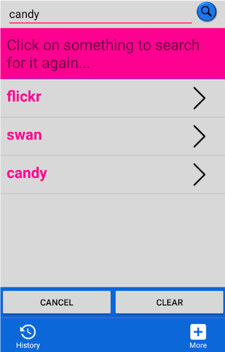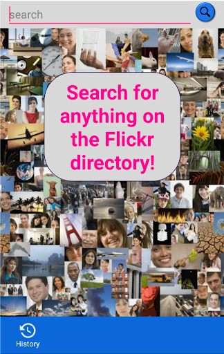 Search for images on the Flickr directory and save them directly to your Gallery! You can also look up previously searched pictures using the "History" tab. Enjoy!