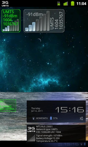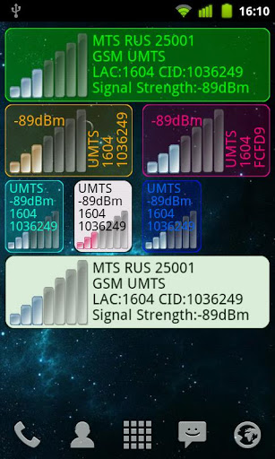 widget displays network and system info.Widget displays the network status, network type EDGE, UMTS, HSDPA, etc. , operator code, operator name, LAC, CID, signal strength.Widget sizes 4x1, 2x1, 1x1.More features available in PRO version: Network type notification; Signal strength notification; Text customization; Color customization; Using custom tags for display additional values, such as LTE signal strength.Tags for text customization:NWOPN Network operator nameNWOP Network operator MCCMNC LAC location Area CodeCID Cell IDPHTP Phone TypeNWTPNetworkTypeSSDBMSignal Strength dBmCDMASIDCDMA System ID of the current cell siteCDMANIDCDMA Network ID of the current cell siteCDMABIDCDMA Base Station ID of the current cell siteESS:NExtra values. MEMFMemory FreeSTOTStorage TotalSTOFStorage FreeSDCTSD Card TotalSDCFSD Card FreeBATPBattery PercentageBATVBattery VoltageTEMPCTemperature CelsiusTEMPFTemperature FahrenheitCDMADBMCDMA RSSI value in dBm CDMAEICDMA EcIo value in dB10 EVDODBMEVDO RSSI value in dBm EVDOEIEVDO EcIo value in dB10 EVDOSNREVDO signal to noise ratio.GSMERGSM error rate 07For more info see online help and widget config.Note: Some Samsung Galaxy S2, Galaxy Tab, Galaxy Note have screwed API and returns unknown signal strength. http:code.google compandroidissuesdetail?id18336If you have no working well signal diagram, you don39;t need to upgrade application to pro version. Supported network types: gprs EDGE, UMTS, CDMA, EVDO 0, EVDO A, 1xRTT , HSDPA, HSUPA, HSPA, IDEN, EVDO B, EHRPD, HSPA