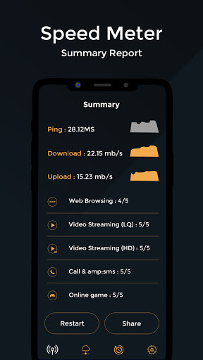 ► Kiểm tra tốc độ cho thiết bị di động giúp đo lường và xác minh tốc độ tải xuống và tốc độ tải lên trong một khoảng thời gian ngắn.
