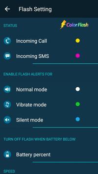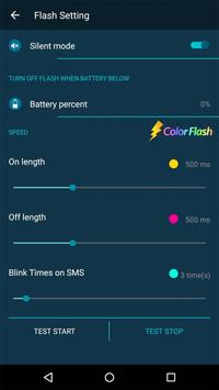 Possible to shake flashlight colors lights on your screen to disable when you receive a call or text alerts. You can turn it off when the battery gets down X% of charge. so you can save battery when Flashoncall. Also use it as text flash alert and message.