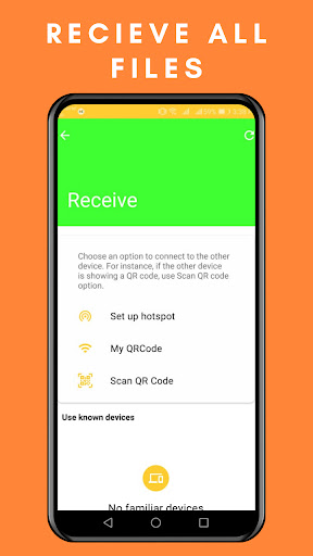 Với ứng dụng chuyển tập tin hàng loạt này, bạn có thể gửi và nhận tệp (truyền tệp an toàn) lớn như bạn muốn là phim, video, vv với tốc độ nhanh hơn 200 lần so với chuyển phát nhanh Bluetooth mà không bị gián đoạn và mất tốc độ truyền tệp. Sử dụng ứng dụng mà không cần bất kỳ kết nối WiFi nào và nếu cần sơ yếu lý lịch và tạm dừng các tệp tải xuống của bạn bất cứ khi nào bạn muốn. Kết nối với mã QR rất dễ dàng và ngay lập tức, chỉ cần chọn các tệp bạn muốn chia sẻ và gửi.