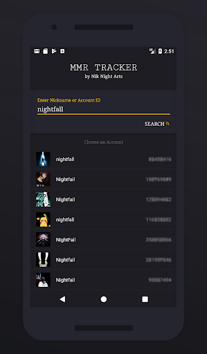 Ứng dụng này sẽ giúp bạn theo dõi MMR trước và sau khi hiệu chuẩn tài khoản. Ứng dụng này không yêu cầu ủy quyền qua Steam! Tìm tài khoản bằng tên trò chơi hoặc ID tài khoản.