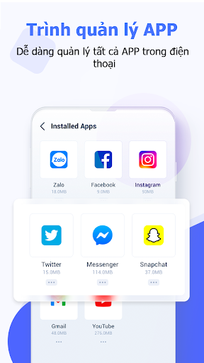 📱Trình quản lý ứng dụng: Bạn có thể xem và quản lý tất cả các ứng dụng được cài đặt trên điện thoại của mình, đồng thời giải phóng bộ nhớ bằng cách đóng các ứng dụng ít sử dụng và dọn rác trong bộ nhớ cache của ứng dụng.