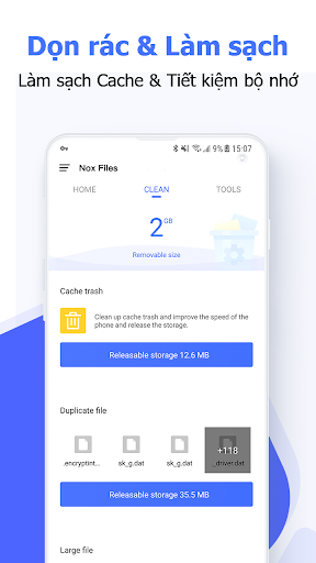 🗑Dọn rác và Làm sạch: Bạn thường xuyên bị thông báo nhắc ""Bộ nhớ điện thoại đã đầy""? Không cần lo lắng nữa, Nox Files sẽ giúp bạn làm sạch bộ nhớ đệm của ứng dụng và hệ thống, dọn sạch các dữ liệu rác làm tiêu tốn dung lượng trong điện thoại. Với trình dọn dẹp chuyên nghiệp, Nox Files sẽ không xóa nhầm tệp và bất cứ dữ liệu cá nhân nào của bạn.