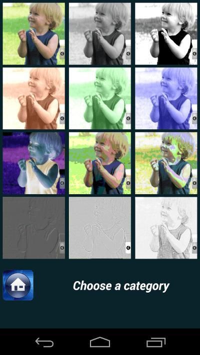 Sau khi chụp ảnh, nếu bạn muốn, bạn có thể sử dụng hiệu ứng hình ảnh tuyệt đẹp, cho phép bạn đạt được kết quả tuyệt vời: màu xám, nâu đỏ đồng bằng, nâu đỏ màu xanh, nâu đỏ màu xanh lá cây, và độ tương phản trắng đen. Bạn có thể đảo ngược hình ảnh, hiệu ứng đá phiến, đá hiệu quả, hiệu ứng màu nước, 64 bit và một hiệu ứng bút chì tuyệt vời.