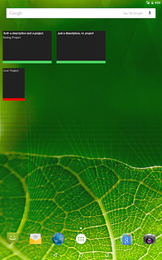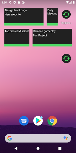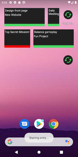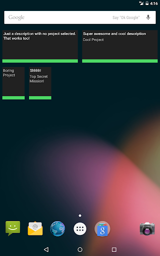 Cách nhanh nhất để tạo các mục thời gian. Tạo các widget trên màn hình chính của bạn. Với các vật dụng này, bạn có thể bắt đầu và dừng các mục nhập thời gian, ngay từ màn hình chính chỉ với một lần nhấn ngón tay của bạn! Bạn có thể chỉ định dự án cũng như mô tả cho các widget. Mỗi widget có thể được kích thước lại theo chiều ngang, để hiển thị nhiều hơn hoặc ít hơn các văn bản. Bạn cũng có thể đặt một widget 'làm mới' ngay trên màn hình chính của bạn. Nhấn Widget làm mới sẽ làm mới tất cả các tiện ích khác của bạn để bạn có thể tìm thấy mục nhập thời gian đang chạy ngay lập tức! Hữu ích Nếu bạn sử dụng nhiều thiết bị / máy tính xách tay / trình duyệt!