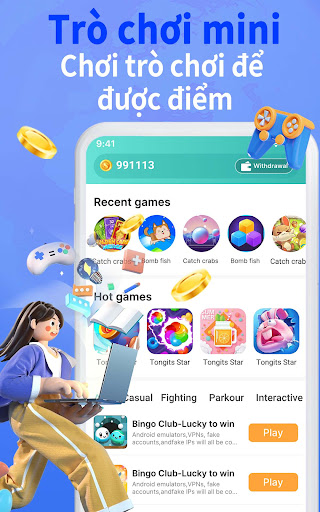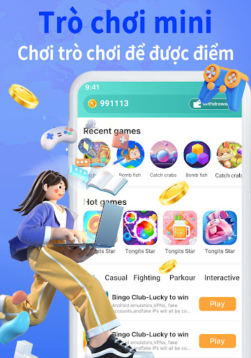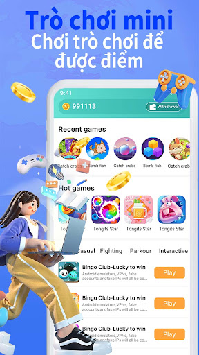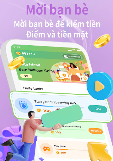 Trò chơi kiếm tiền là một ứng dụng để kiếm tiền thật bằng cách chơi trò chơi hoặc hoàn thành nhiệm vụ. Chúng tôi cung cấp nhiều cách khác nhau để kiếm tiền. Bạn có thể kiếm tiền khi chơi trò chơi. Bạn càng chơi, bạn càng kiếm được nhiều tiền. Chúng tôi cung cấp cho bạn nhiều nhiệm vụ, bạn có thể tự do lựa chọn và kiếm tiền chỉ trong vài phút. Xem video cũng có thể dễ dàng kiếm được phần thưởng.