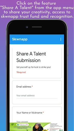 Mong muốn của mọi giải trí sắp tới sẽ trở nên phổ biến và sau đó kiếm được từ hàng thủ công đó. Skwnapp muốn giúp sáng tạo để hiện thực hóa mong muốn của họ. SKWNAPP là một sản phẩm phần mềm thu hẹp khoảng cách giữa tài năng và cơ hội và các nhóm tài năng khác để kết nối với nhau và cũng để chuẩn bị cho cuộc thi hàng năm của chúng tôi "Giải thưởng nhận dạng sáng tạo SKWNApp của chúng tôi" sẽ giúp họ thể hiện tài năng của họ và được thưởng cho nó trong quá trình