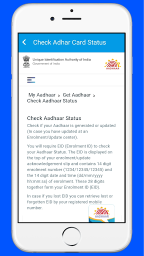 Use All Services Online with the Help Of this app. This services is provided by the Unique Identification Authority of India (UIDAI). Users can check status of their aadhar card by entering enrolment number, date and time given on acknowledgement slip. So thank u all.