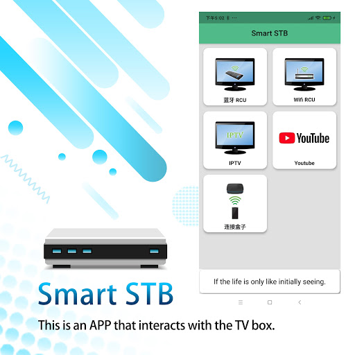 This is an APP that interacts with the TV box. You can use the APP to control the TV box remotely.(Bluetooth RCU/Wifi RCU) The APP lets you stream youtube to your TV. You can watch IPTV.
