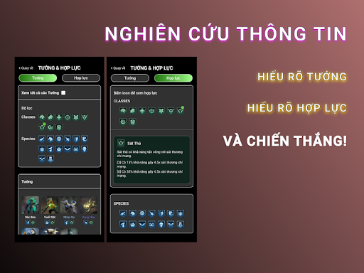 Xem thông tin Tướng theo từng Class, Species. Xem thông tin hiệu ứng Synergy.