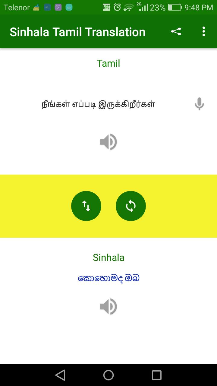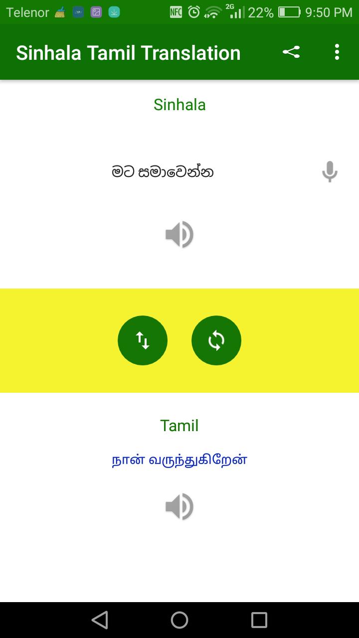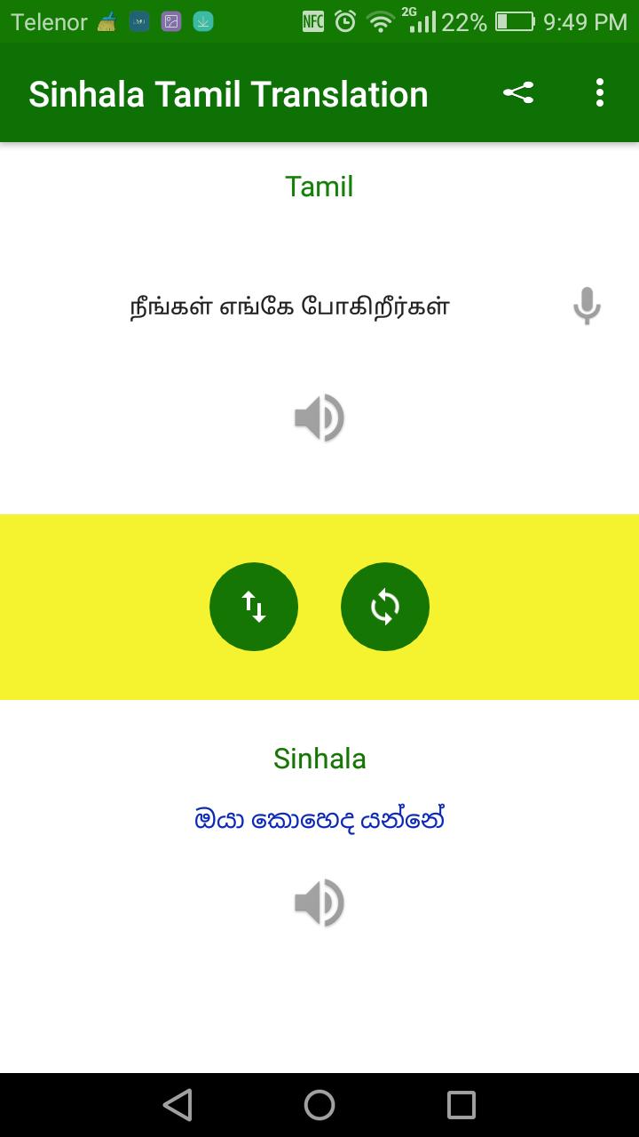 Translate Sinhala to Tamil and Tamil to Sinhala with this FREE app. It can translate text, words and sentences in split seconds. It is like a dictionary and used for words meaning and accurate pronunciation.