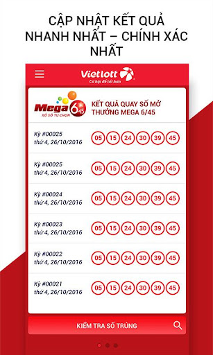 Ứng dụng sẽ giúp bạn cập nhật các sản phẩm mới nhất, cập nhật nhanh nhất, chính xác nhất giá trị giải Jackpot và kết quả quay số mở thưởng các sản phẩm xổ số tự chọn số điện toán. Ứng dụng cho phép bạn tra cứu kết quả vé số dự thưởng và tần suất xuất hiện của các bộ số cực nhanh chóng. Hoặc bạn cũng có thể tìm kiếm ngay các điểm bán hàng gần nhất với mình.