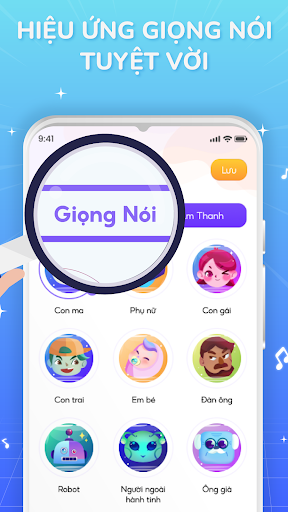 - Trình đổi giọng nói - Chỉnh sửa âm thanh giúp bạn có những giây phút vui vẻ, thư giãn cùng với bạn bè và người thân. Bạn có thể tự tin hát hay những bài hát vui nhộn mà bạn yêu thích với hiệu ứng hát Karaoke, đồng thời có thể ghi âm và quay video rồi chỉnh sửa giọng nói kèm những âm thanh hài hước và chia sẻ chúng với bạn bè, gia đình.