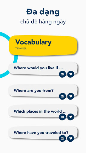Chỉ cần chọn cấp độ, Say Hello sẽ chủ động cung cấp cho bạn ngữ pháp, từ mới và các chủ đề giao tiếp phù hợp với trình độ. Thay đổi cấp độ bất kì lúc nào bạn muốn để có thể nâng cấp tiếng Anh cũng như làm quen thêm nhiều người bạn mới trên toàn cầu.