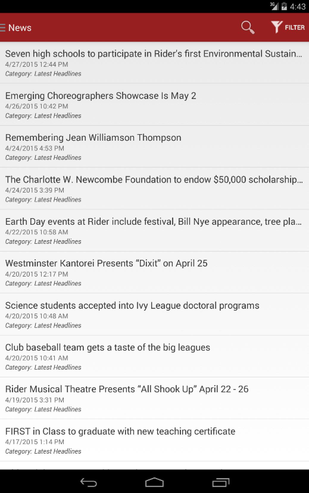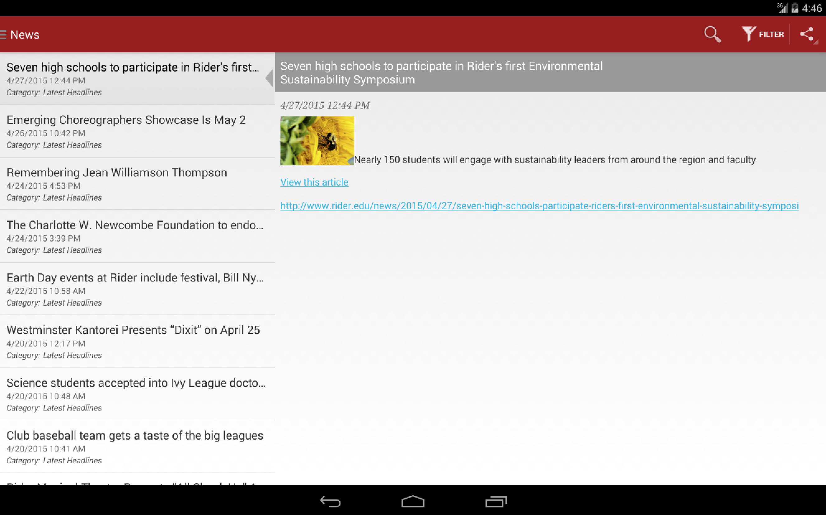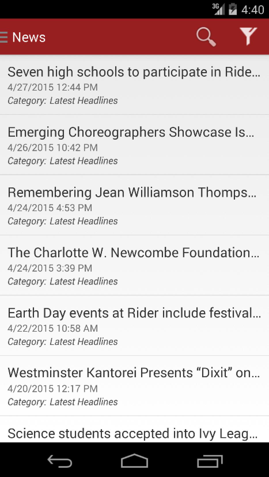 Note: For news articles, users must open up safari or another device browser to read the full article. For event details, users must use the main Rider website at http://www.rider.edu to access further detail.