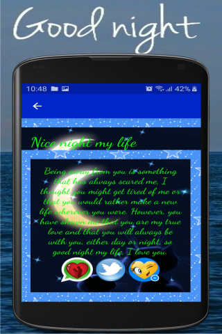 Ứng dụng của chúng tôi "Chúc ngủ ngon tình yêu của tôi" là miễn phí và chúng tôi đã tạo ra nó cho tất cả các thiết bị Android (điện thoại di động và Máy tính bảng), một khi bạn đã cài đặt, không cần thiết phải được kết nối với Internet và rất nhẹ, bạn có thể chia sẻ nhanh chóng thông qua các mạng xã hội yêu thích, tin nhắn văn bản hoặc email.