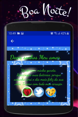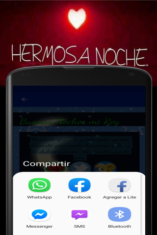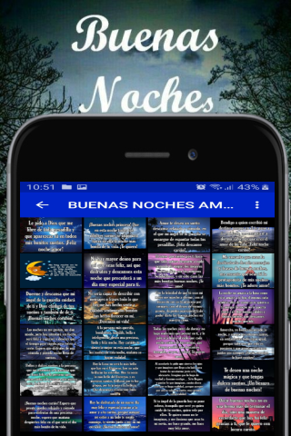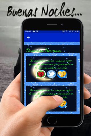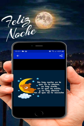 Ứng dụng của chúng tôi "Chúc ngủ ngon tình yêu của tôi" là miễn phí và chúng tôi đã tạo ra nó cho tất cả các thiết bị Android (điện thoại di động và máy tính bảng), một khi chúng đã cài đặt không cần thiết phải được kết nối với Internet và rất nhẹ bạn có thể chia sẻ nhanh chóng Mạng xã hội yêu thích của bạn, và chắc chắn sẽ giúp bạn ngủ ngon hơn và người đặc biệt mà bạn có ở bên cạnh bạn và để làm cho nó cảm thấy rất quan trọng vì nó là dành cho bạn và bạn quan tâm đến việc bạn yêu thích bao nhiêu. Cập nhật định kỳ và bao gồm cả Chỉ những cụm từ, Piropos thực sự yêu những hình ảnh của tình yêu với những câu thơ lãng mạn hơn để chia sẻ bởi các mạng xã hội