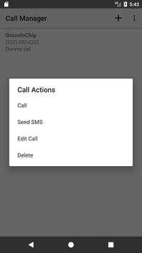 - Click on a call in the list to open a dialog box with a number of options: call, edit, send SMS, and delete. Choosing 'call' will immediately dial the number, 'edit' will allow you to edit the details of the call, 'Send SMS' will allow you to send a text, 'Set Reminder' will allow you to schedule a notification that will remind you to make your phone call, and 'Delete' will prompt the user to delete the call (the user can cancel).