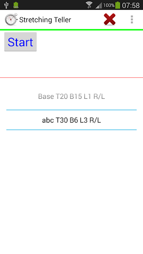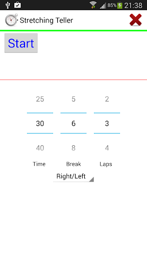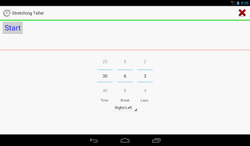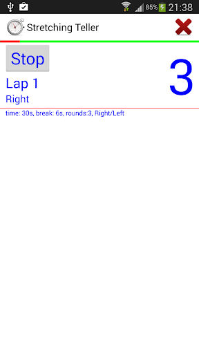 Handy basic timer for stretching exercises. The timer shows the time and plays a sound when starting, finishing and between laps. Start and end have a different sound.