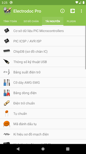 • Tài nguyên (PIC ICSP / AVR ISP, ChipDB (sơ đồ chân IC), Thông số kỹ thuật USB, Bảng suất điện trở, Cỡ dây AWG-SWG, Bảng dòng điện, Điện trở chuẩn, Tụ chuẩn, Mã đánh dấu tụ, Kí hiệu sơ đồ mạch điện, Kích thước đóng gói SMD, Biểu tượng và Từ viết tắt, Tiền tố Đơn vị SI, Bảng ASCII, Các cổng Logic Boolean, IC nhóm 7400, Thông tin Công tắc, IC 78xx, Pin, Pin đồng xu, Bảng dB, Tần số vô tuyến, Bảng chuyển đổi PT100, Mã màu cầu chì, Mã màu cầu chì Ô tô, Mã màu DIN 47100, Mã hiệu IP, Ổ cắm & Phích cắm trên thế giới, Kết nối IEC, Kết nối NEMA);