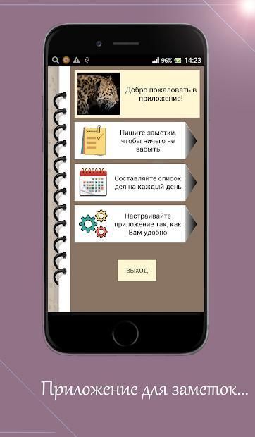 В данном приложении можно не только писать заметки, но и планировать каждый день. Вы сможете добавлять картинки, пароли и уведомления, а также пользоваться меню для быстрого поиска нужных записей. Чтобы не потерять данные при программном сбое, предусмотрены функции резервного копирования и восстановления данных.