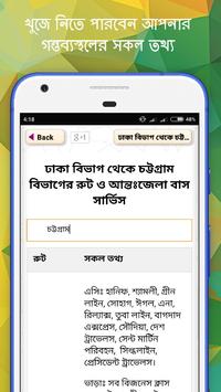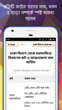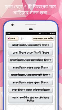 এখানে থাকছে ঢাকা থেকে বিভিন্ন জেলায় যাতায়াতকারী এসি এবং ননএসি বাসগুলোর নাম, ভাড়ার পরিমান, ছেড়ে যাওয়ার স্থান, ফোন নাম্বার এবং টার্মিনালভেদে কোন কোন অঞ্চলে বাসগুলো যাতায়াত করে প্রভৃতি সংক্রান্ত তথ্য। দেশের সবগুলো বিভাগ যথা চট্টগ্রাম, বরিশাল, রাজশাহী, রংপুর, সিলেট, খুলনা, ঢাকা ও ময়মনসিংহ