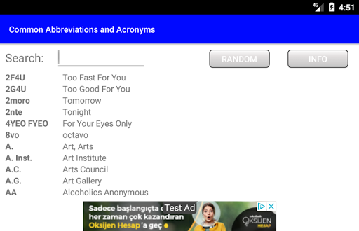 This app lists almost 1000 abbreviations and acronyms, which are commonly used in emails or instant messenging tools. They are listed in an easily browsable format and the implemented search function lets user to find the meaning of the abbreviation or acronym fast.