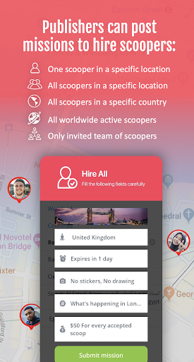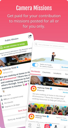 Các tổ chức phương tiện truyền thông có thể đăng các nhiệm vụ camera trên myscoop Bản đồ cho tất cả người dùng hoặc thuê các Scooper cụ thể dựa trên vị trí hoặc sở thích của chúng và lấy các cảnh quay chính xác mà họ cần trong thời gian kỷ lục.