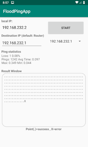 This app sends a mass of ICMP-messages (Echo Requests, ping) to an IP-address of your choice. You can detect packet loss problems in your network. This app supports wifi and mobile network. In most mobile networks the next router is not pingable. In this case the destination address will switch to 1.1.1.1