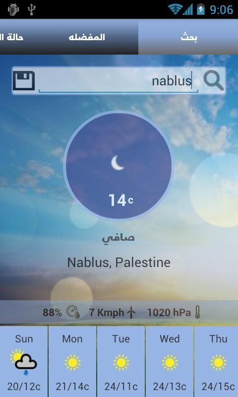 Weather Palestine is an application works on display weather for major cities of Palestine in addition to finding the case of the place where the weather is located by determining the user's location