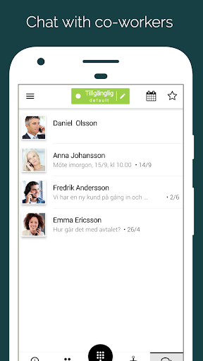 Với MEX, bạn có thể buộc các số bầu cử trực tiếp hiện có trong thiết bị với điện thoại di động.Bạn chỉ cần theo dõi số điện thoại - số ròng cố định.Sau đó, bạn sẽ có quyền truy cập vào tất cả các dịch vụ điện thoại trực tiếp trên điện thoại di động của mình như thể đó là điện thoại cố định. Điện thoại cố định khi bạn đến văn phòng của bạn và tiếp tục ở đó.Với ComCenter Smart, bạn có được tự do hoàn toàn và sử dụng điện thoại phù hợp nhất.Luôn luôn!Nó là đủ để bạn biết tên.Các đồng nghiệp của bạn đặt ra cách họ muốn trả lời với hồ sơ của họ.Đăng nhập và ra khỏi hàng đợi trực tiếp trong ứng dụng. Kết nối kết nối với cùng một thiết bị và bạn gọi hoàn toàn miễn phí giữa các văn phòng.