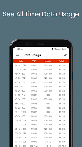 • Xem toàn bộ việc sử dụng dữ liệu hàng ngày từ menu lịch sử sử dụng dữ liệu