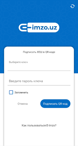 Ứng dụng di động E-Imzo dành cho việc ký các tài liệu điện tử nhanh chóng và thuận tiện bằng các khóa điện tử do NT NT GNA của Cộng hòa Uzbekistan cấp.Một tài liệu điện tử cho chữ ký được hình thành bởi một ứng dụng khác hoặc trên trang web dưới dạng mã QR và được truyền đến ứng dụng di động E-Imzo để chọn phím EDS và ký.