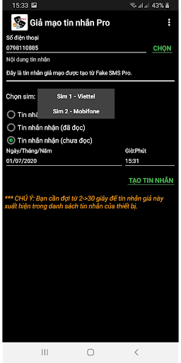 Với Fake SMS Pro, bạn có thể tự tạo cho mình những tin nhắn giả hoàn toàn miễn phí từ người yêu, bạn bè, người thân hay bất kỳ ai mà bạn muốn. Bạn có thể chọn sim, chọn thời gian, chọn kiểu tin nhắn: Đã gửi, Đã nhận (chưa đọc), Đã nhận (đã đọc),...