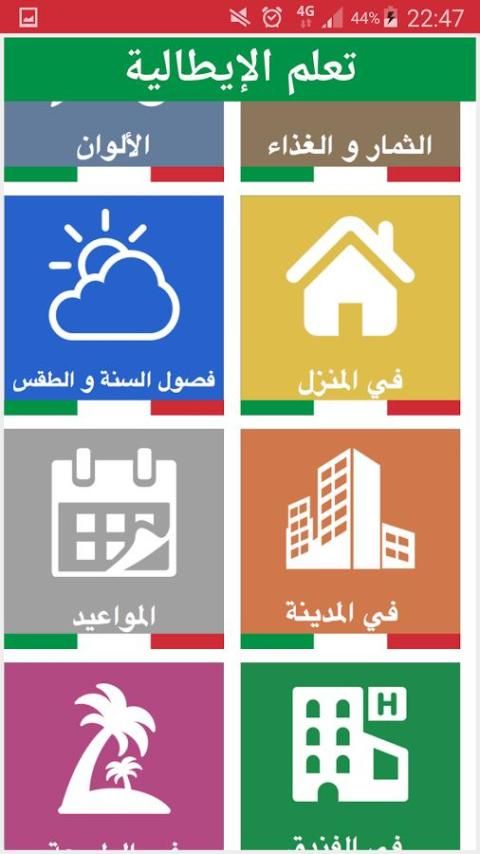 Application Athoi 33 familiarize includes more than 1,000 words and sentence in Arabic and Italian both in writing and voice (with the original pronunciation of the word) and the lessons are as follows: