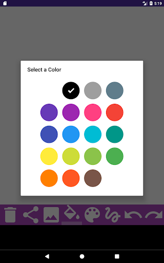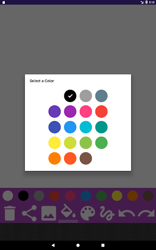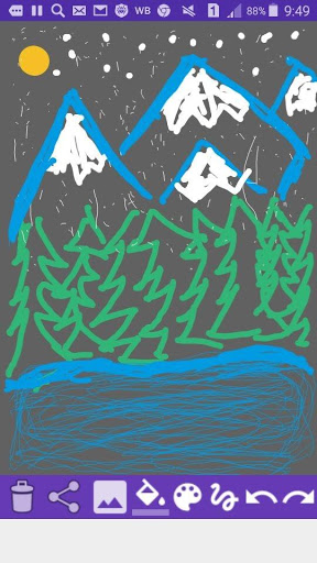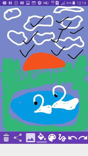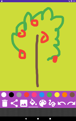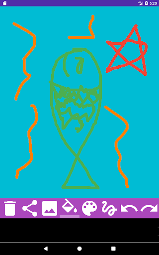 A simple set of tools – fill the background, paint brush and palette. Any action can be cancel and return back. To clear the canvas and share the picture in social networks or message. You can draw on canvas uploaded from the gallery the image or photo taken.