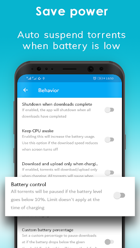 ✔ Battery Saver feature- suspends torrents when battery goes below a predefined level
