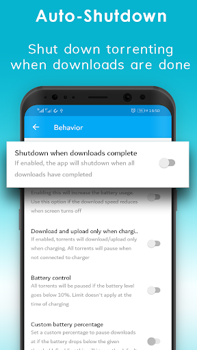 ✔ Auto-shutdown feature to save battery + data. Automatically shut down torrenting when downloads are done and app is in background