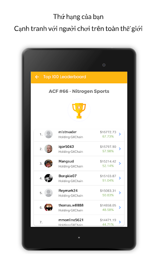 Ứng dụng giả lập giao dịch tiền điện tử sử dụng sổ lệnh thực và bạn có thể chọn từ hơn 100 altcoin để giao dịch. Chúng tôi tổ chức các cuộc thi giao dịch tiền điện tử giả tưởng hàng tuần với người chơi trên thế giới trong trình giả lập giao dịch.