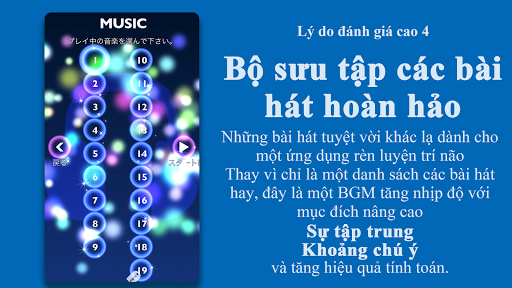 Bộ sưu tập các bài hát hoàn hảoNhững bài hát tuyệt vời khác lạ dành cho một ứng dụng rèn luyện trí nãoThay vì chỉ là một danh sách các bài hát hay, đây là một BGM tăng nhịp độ với mục đích nâng caoSự tập trungKhoảng chú ývà tăng hiệu quả tính toán.