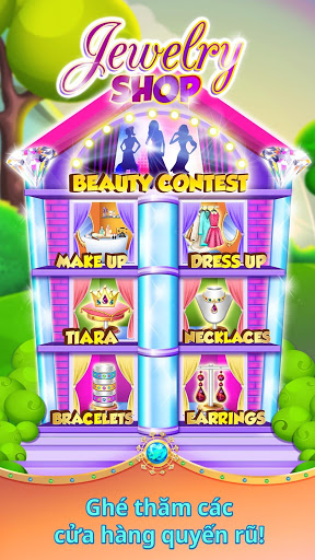 Sau đó, hãy ghé thăm công chúa và spa trang sức mở cửa cho tất cả những ai yêu thích thời trang trang điểm và làm những trò chơi trang sức. Phù hợp với mảnh đồ trang sức lấp lánh của bạn với bóng mắt đẹp, son môi, mascara và đỏ mặt.