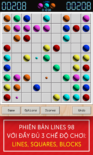 LINES 98 là một trong những trò chơi kinh điển hay và hấp dẫn thuộc thể loại game trí tuệ chơi mãi không chán. Nhiệm vụ của bạn là lần lượt sắp xếp vị trí của các viên bóng thành một hàng trong đó có ít nhất 5 quả bóng có cùng màu sắc theo đường dọc, đường ngang hay đường chéo tùy ý để loại bỏ chúng khỏi màn hình. Sắp được càng nhiều bóng theo thứ tự thì số điểm bạn giành được càng cao. Sau mỗi lượt đi sẽ có thêm 3 bóng mới xuất hiện, bạn cần tính toán để chơi được càng lâu càng tốt.