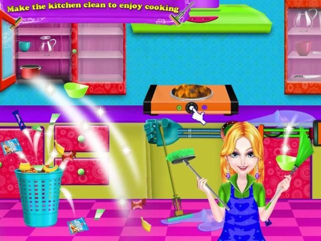 After bedroom cleaning, move to the kitchen and clean it. Neat and clean kitchen appeals your mother to cook more delicious food for you. Star chef can show his skills extra ordinarily only if he has a clean kitchen. So wash dishes and collect garbage for great cooking.