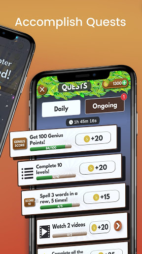Chơi trực tuyến hoặc ngoại tuyến bất cứ lúc nào, bất kể bạn đang ở đâu! Trò chơi sẽ lưu từ điển, tiến trình của bạn và điểm thiên tài cao hàng ngày vào điện thoại của bạn!