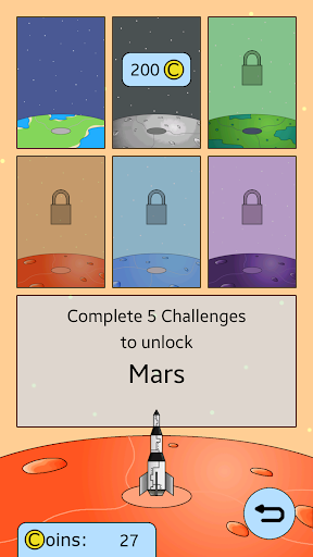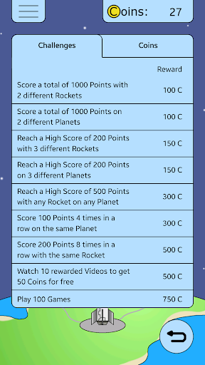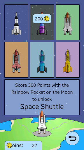 Fly in your rocket through space and dodge the asteroids. Unlock new rockets and planets. Complete all challenges to earn Coins to buy the unlocked rockets and planets.