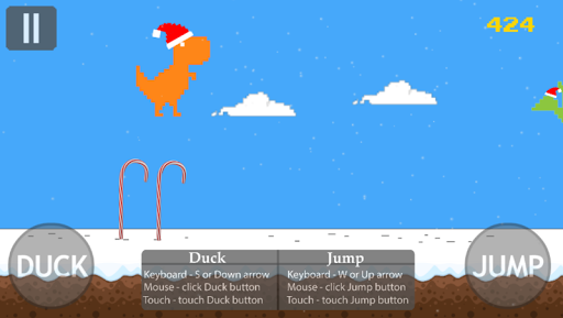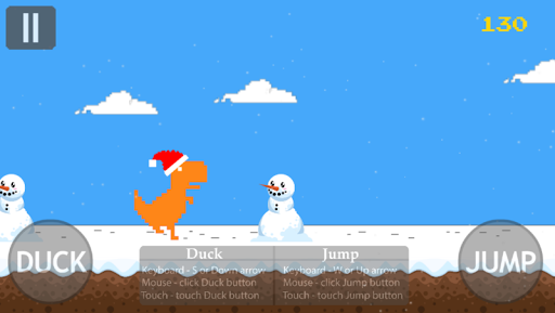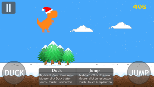 Christmas hidden Dino T-Rex game Remaked, T-Rex game from browser offline mode. Touch the screen to start the game, jump and duck to avoid pterodactiles and christmas trees/candy canes/snowman saving your T-Rex life. Control your dino TRex in this infinite Christmas runner game.
