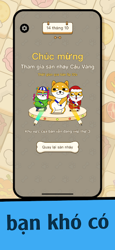 Doggo Go là một trò chơi ghép 3 ô hình vui nhộn, và chỉ 1% người chơi trên toàn thế giới có thể qua Level 2 và nhận được những “Cậu Vàng” meme nhảy nhót siêu ngộ nghĩnh! Người chiến thắng sẽ nhận được nhiều loại cún cưng cực dễ thương với những bộ trang phục đặc biệt. Hãy cùng toả sáng với Cậu Vàng trên sàn nhảy! Đánh bay mọi mệt mỏi và rinh về những chú chó ngộ nghĩnh, vui nhộn nhé!